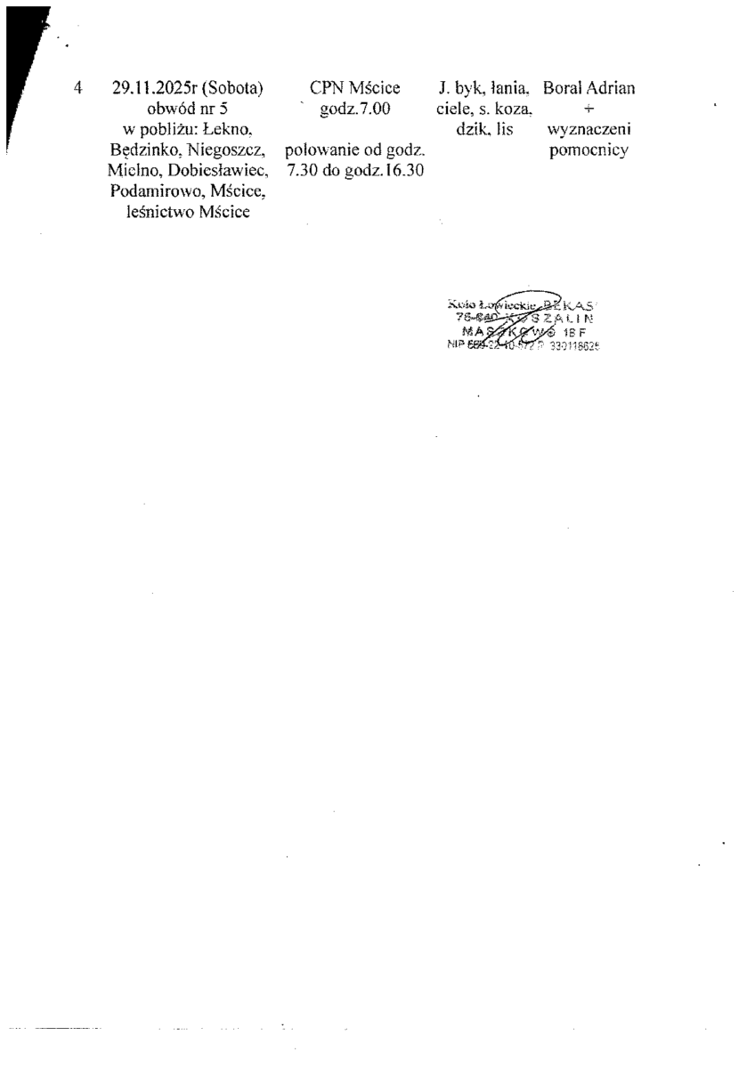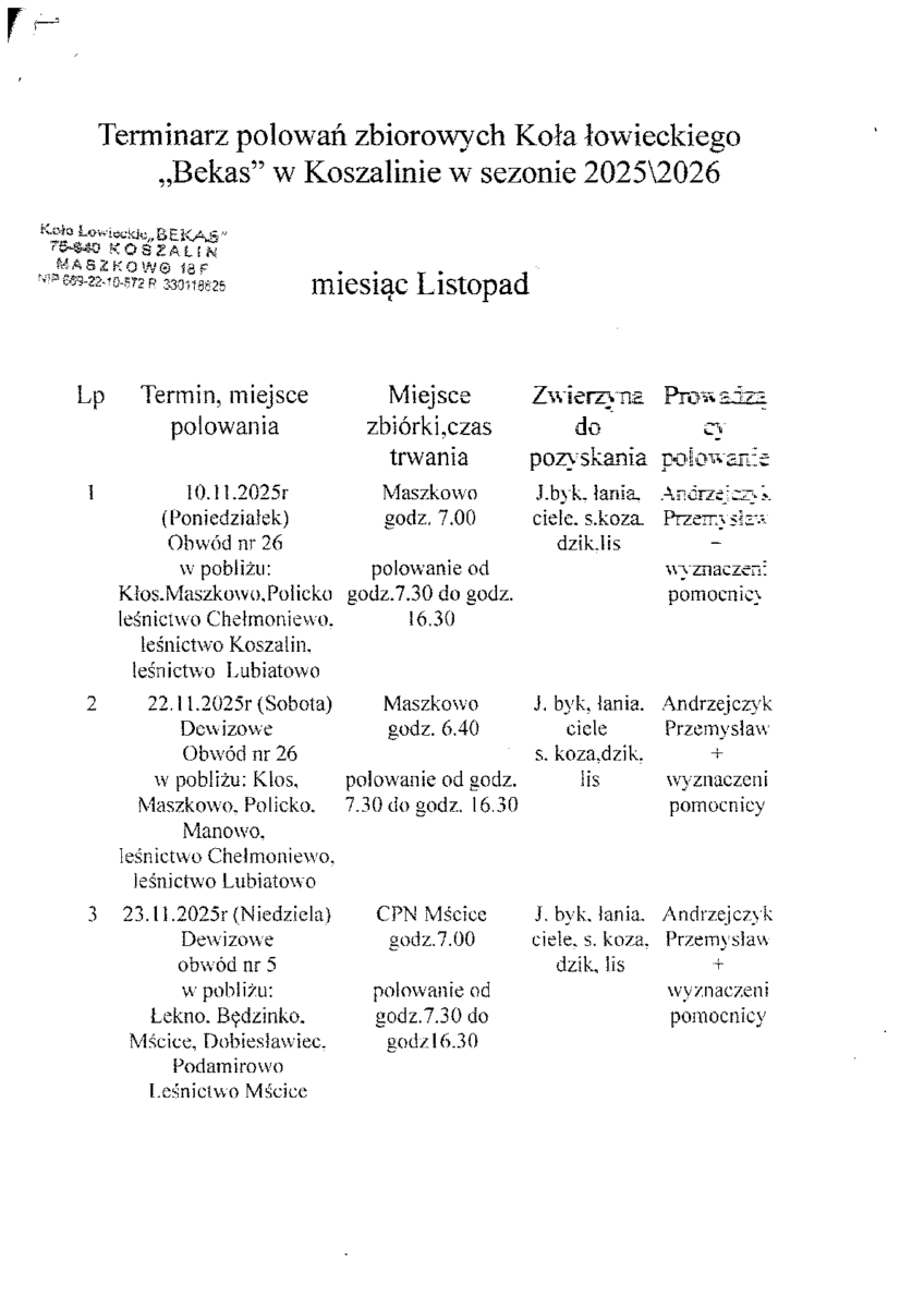Zarząd Koła Łowieckiego BEKAS w Koszalinie informuje o polowaniach zbiorowych, które odbędą się w miesiącu LISTOPAD 2025 r. w dniach 07 i 08 listopada 2025 r. na terenie obwodu łowieckiego nr 5.