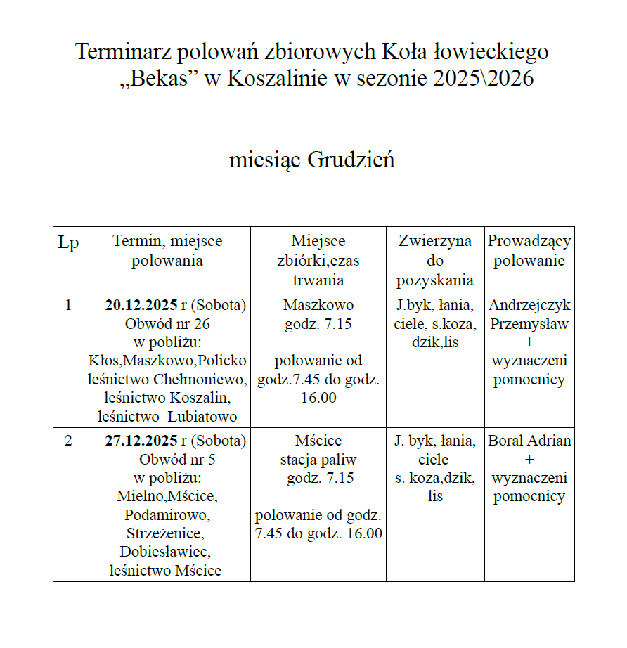 Zarząd Koła Łowieckiego BEKAS w Koszalinie informuje o polowaniach zbiorowych, które odbędą się w miesiącu grudzień 2025 r.