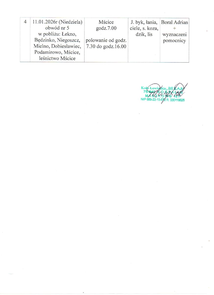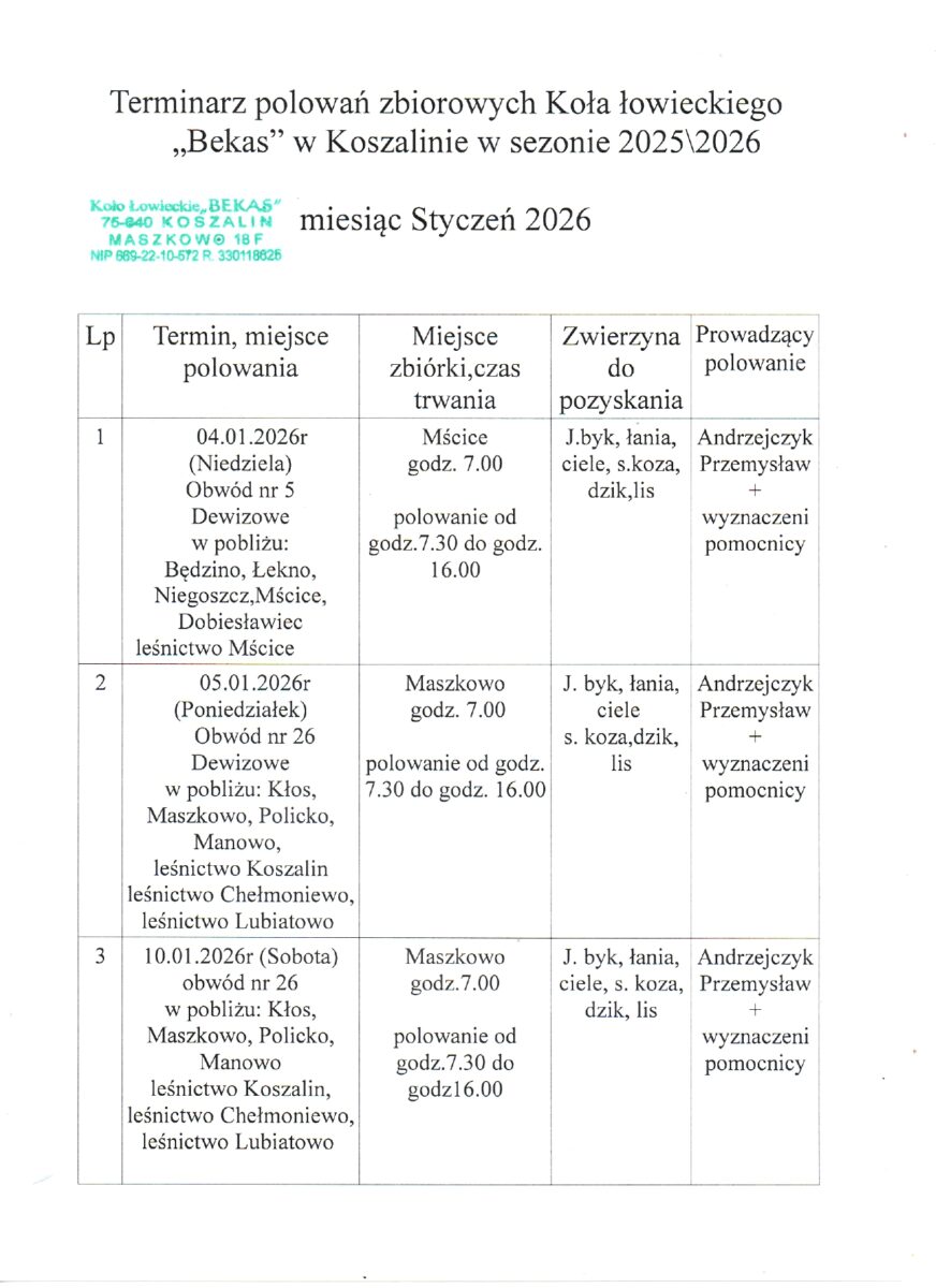 Zarząd Koła Łowieckiego BEKAS w Koszalinie informuje o polowaniach zbiorowych, które odbędą się w miesiącu styczeń 2026 r.